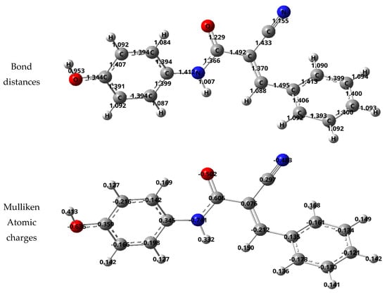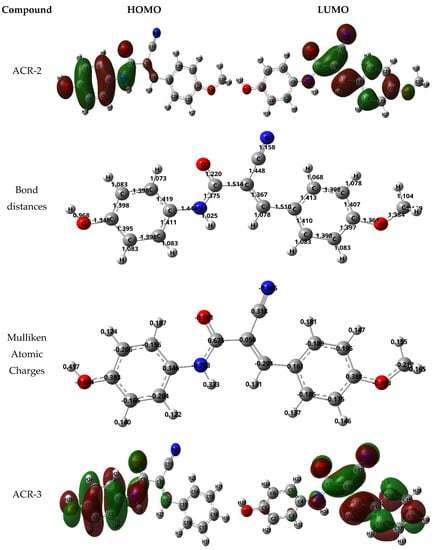 Bond distances, Mulliken atomic charges, HOMOs, and LUMOs, of compounds ACR-2 and ACR-3.