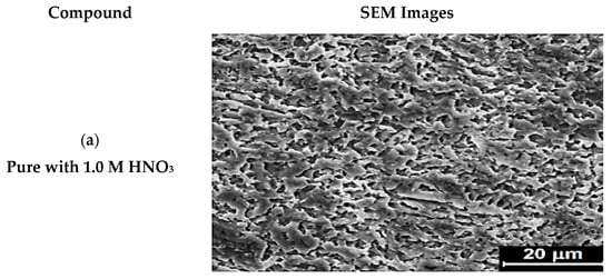 Figure 18 illustrates the sample of Cu coupons exposed for 5 hours to 1.0 M nitric acid in the lack (without an inhibitor) and the existence of an inhibitor (20 × 10−5 M). Figure 18a of the SEM photos shows how the corrosion product caused severe damage to the Cu surface. Figure 18b,c show how the Cu surface improved by adding inhibitors to its maximum concentration [].