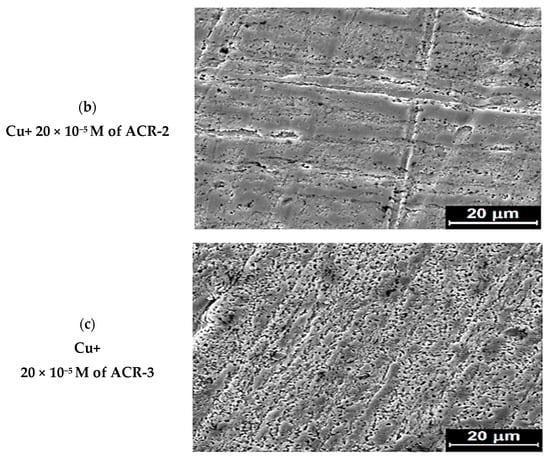 SEM images from Cu (a) after soaking time for 5 h in 1.0 M HNO3, and (b) in the 20 × 10−5 M inhibitor ACR-2 (c) in the 20 × 10−5 M inhibitor ACR-3.