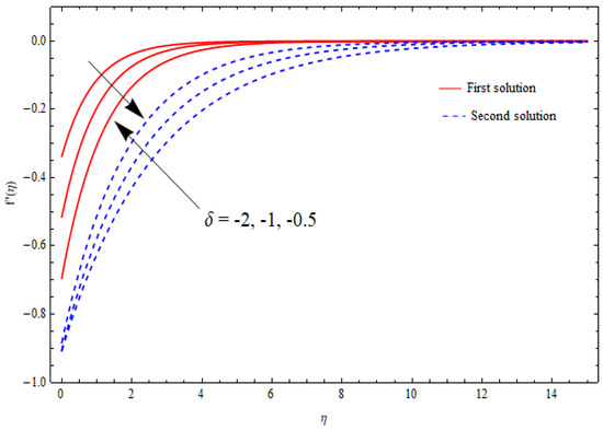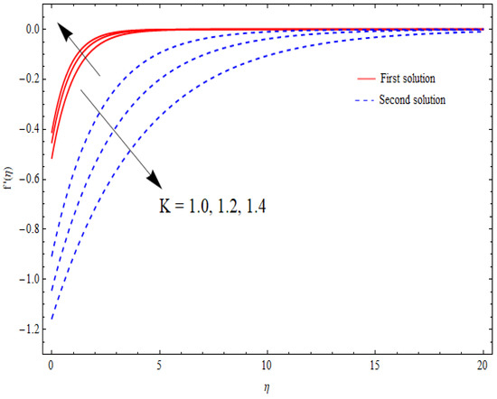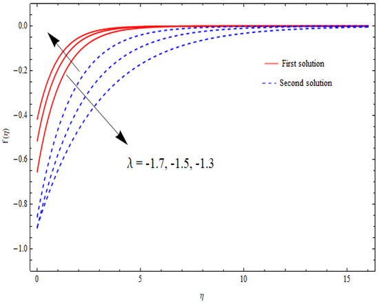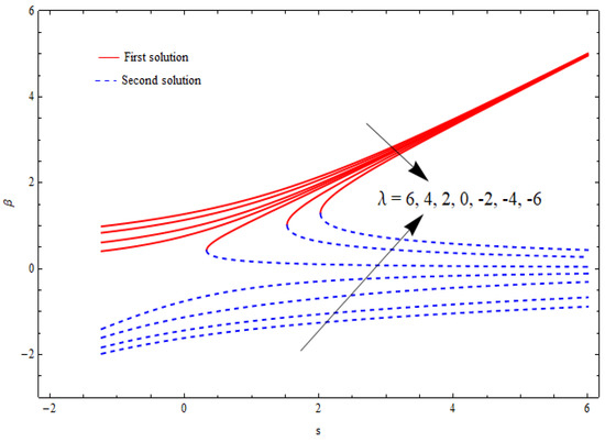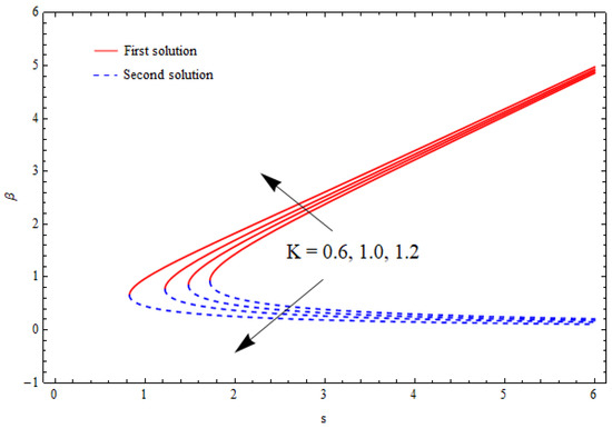 Figure 2, Figure 3, Figure 4 and Figure 5 show the relationship between the solution domain and the stretching/shrinking parameter porosity parameter nanoparticle volume fractions , and the suction parameter for both the upper- and lower-branch solutions. From these figures, it was noted that the solution profiles were significantly affected by the porosity parameter as a function of the suction and shrinking parameters. It can be seen from Figure 2 and Figure 3 that an increase in gave a gradual increment to the first solutions of and reduced the second solutions of . Furthermore, the solution domain became wider with the uplifting values of the porosity parameter. Apparently, Figure 4 reveals that the solution profiles were enhanced with a higher value of the stretching/shrinking parameter for both solutions. In Figure 5, the solution domain is captured against the mass suction parameter with distinct values of the nanoparticle volume fraction . As expected, the solution profiles decreased for the first solution and were enhanced in the second solution with the growing nanoparticle volume fraction .