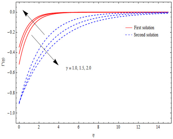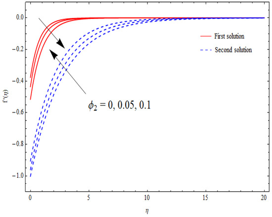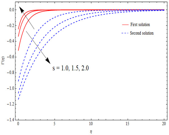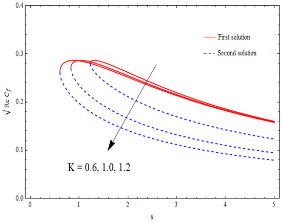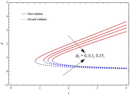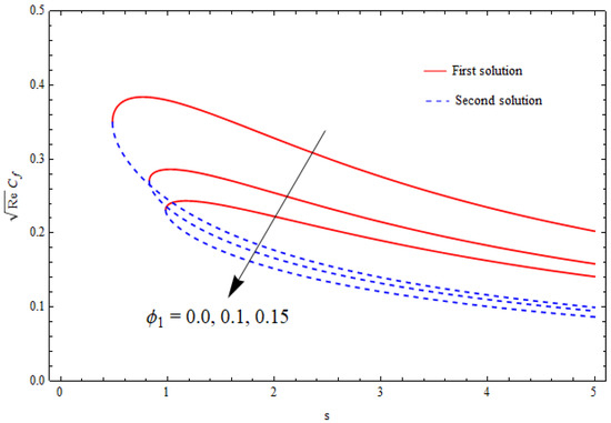 The graphical data for the skin-friction coefficient against the suction parameter for distinct values of and are demonstrated in Figure 13 and Figure 14. Again, this data suggested the existence of dual solutions for a specific range of mass suction past a shrinking sheet. It was further depicted from these figures that the critical values of mass suction lay in the range for and . In addition, the critical values in Figure 13 and Figure 14 decreased with higher values of these parameters. The role of the nanoparticle volume fraction was to significantly enhance the skin-friction coefficient for both solutions. Contrary results were seen for the porosity parameter .