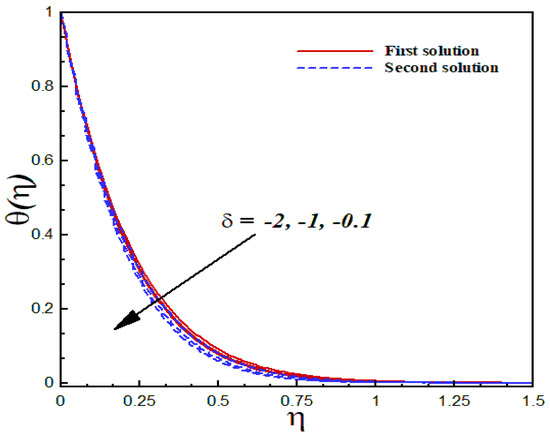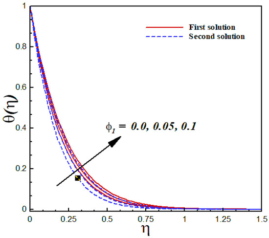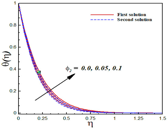 The thermal characteristics of the hybrid nanofluid flow are illustrated graphically through Figure 15, Figure 16, Figure 17 and Figure 18 for several values of the physical parameters , and . In each figure, we observed the dual nature of the temperature profiles for shrinking flow with specific mass suction. The effects of the second-order slip parameter on the dimensionless temperature profiles inside the boundary layer are displayed in Figure 15. As expected, the temperature curves showed a decreasing behavior with an uplifting value of the second-order slip parameter in both solutions. The computed results of the thermal transport of the hybrid nanofluid are illustrated in Figure 16 and Figure 17 in the form of temperature fields with several values of the nanoparticle volume fraction. According to these figures, an increasing value of the nanoparticle volume fraction significantly enhanced the temperature field for both the solutions. Figure 18 reveals the outcome of the suction parameter on the dimensionless temperature distributions inside the boundary layer region. The suction parameter significantly affected the temperature curves and showed an increasing trend with a greater value of .