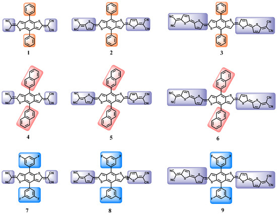 In this work, benzodithiophene was selected as the core, which is generally a key structure of the donor unit in D-A/D-π-A polymer electronic donors in OPV [18,19,20,21,22,23,24]. For the NLO materials, the centrosymmetry is a basic structural feature, and the molecular structure of the D-A-D type has symmetry itself. For organic molecules, because the D-A-D molecular structure has a significant ICT effect, it is easy to achieve better photo response characteristics, and the ICT of molecules can be adjusted by changing the electronic structure of the side chains and the conjugate length of the molecules so that nine molecules were designed with a terminal dicyanomethylene acceptor as the end-group, and thiophene as a conjugate extension, meaning that the electron-deficient terminal groups could be conducive to enhancing the molecule’s absorption coefficient. Among the nine compounds, as displayed in Figure 1, compounds 1–3, 4–6, and 7–9 were designed by extending the molecule’s conjugated length by increasing the thiophene rings. The compounds 1–3, 4–6, and 7–9 modified the benzodithiophene with phenyl, naphthyl, and difluorinated phenyl groups, respectively. Based on this modification strategy, the influence of the conjugated length of the molecule and the molecular electronic structure changes on linear optical and third-order NLO properties were deeply explored for compounds 1–9. The molecular electronic structure, energy gap, second hyperpolarizability (γ), UV−vis spectra, excited hole-electron character, and anisotropy of the induced current density (AICD) are comprehensively investigated by density functional theory (DFT) calculations. The calculated results indicate that compounds 3, 6, and 9 exhibited marvelous third-order NLO properties. With the compound’s conjugation length increased, the Egap is smaller, and the UV-vis response range is wider, with the linear response intensity and the third-order NLO response being stronger. On account of this, this NLO material design strategy will help to develop new high-performance organic NLO materials.