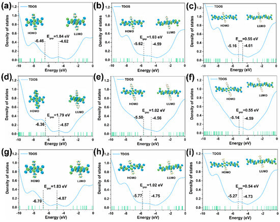 All the geometries were optimized in the gas phase under the B3LYP-D3(BJ)/def2SVP level. As shown in Figure 2, Figures S1 and S2, all the molecules are rigid and planar along the main skeleton. The HOMOs (highest occupied molecular orbitals), LUMOs (lowest unoccupied molecular orbitals), and the energy gaps (Egap) of the nine molecules are calculated as displayed in Figure 2. The HOMO energy of compound 1 was −6.46 eV, with a LUMO energy of −4.62 eV and an Egap of 1.84 eV. Similarly, the HOMO and LUMO energy of compound 2 were −5.62 eV and −4.59 eV, respectively, with an Egap of 1.03 eV. The remaining compounds 3, 4, 5, 6, 7, 8, and 9 had a HOMO energy of −5.16, −6.36, −5.58, −5.14, −6.70, −5.77, and −5.27 eV, respectively. While their LUMO energy was found to be −4.61, −4.57, −4.56, −4.59, −4.87, −4.75, and −4.73 eV, respectively, with an Egap of 0.55, 1.79, 1.02, 0.55, 1.83, 1.02, and 0.54 eV, respectively. The order of Egap for the compounds was: compound 1 < compound 2 < compound 3, compound 4 < compound 5 < compound 6, compound 7 < compound 8 < compound 9. It is clearly shown that with an increase in the molecule’s conjugated length, the Egap decreased. The TDOS (total density of states) plots were calculated to show the population evaluation of each orbital, which reflects the number of molecular orbitals (MOs) in the unit energy interval at the corresponding energy.