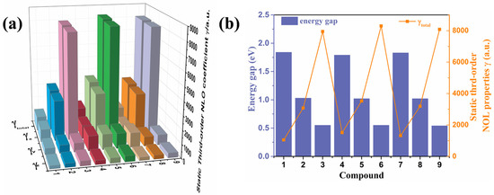 (a) Static third-order NLO coefficients (γ) of the compounds (1–9); (b) the relationship between the static third-order NLO polarizabilities and Egap.