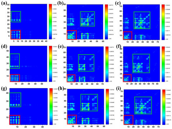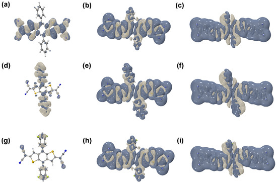 In order to deeply understand the charge transfer characteristics of the molecules in their excited states, we calculated the transition density matrix (TDM) plots, as shown in Figure 9. The TDM plots can be more intuitive in reflecting the information of the ICT as well as the specific contributions of the electrons, holes, and electron-hole overlaps. Here, the red frame region represents the central benzodithiophene moiety, and the green frame region represents the thiophene, phenyl, naphthyl, and difluorinated phenyl or C(CN)2 groups. Based on the calculated TDM results, all the molecules exhibited significant ICT behavior. Except for compounds 1, 3, and 5, the electron-hole pairs of other compounds were mainly localized along with the diagonal element. The results suggest the electron transition involves the whole molecule, which is beneficial for intramolecular charge transfer. Compounds 1, 3, and 5 with the structure of the benzodithiophene are substituted with the phenyl, naphthyl, and difluorinated phenyl groups, and the benzodithiophene is directly combined with the dicyanomethylene end-group. For the small, conjugated distance, for compounds 1, 3, and 5, the twist structure between benzodithiophene and the side substituents (phenyl, naphthyl, and difluorinated phenyl groups) had lost the delocalized electric to a great degree so that the structure-property of compounds 1, 3, and 5 further enhanced the electron-hole transition coherence and did not benefit from ICT, as displayed in Figure 9a,d,g. Among all the compounds, compounds 3, 6, and 9 show the most remarkable ICT effects, followed by the largest molecule conjugation length and smaller Egap. Moreover, the off-diagonal part of the TDM also exhibited the probability of electron transformation, which contributed to the molecule’s charge transfer.