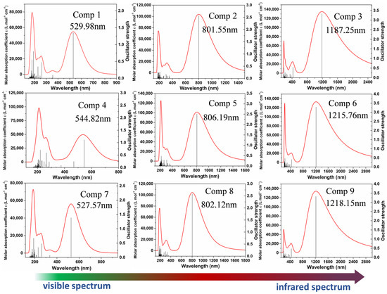As displayed in Figure 8, the absorption spectra of the compounds were obtained by TDDFT calculations at the CAM-B3LYP/def2SVP level. We first obtained the excited state energy and oscillator strength, and the excited state energy was converted into nm units. They were then expanded into curves and added together, and the spectra were broadened by a Gaussian function with a full width at half maximum (FWHM) of 0.6667 eV. The transition energy E (eV), oscillator strength (f), maximum absorption wavelength λmax (nm), and molecular orbit transition contributions of the investigated compounds (1–9) are presented in Table 3. The calculated λmax of the compounds (1–9) is attributed to the electron excited from the ground state to the first excited state. The simulated compounds absorption spectra ranged from visible light and extended into the infrared region. The simulated compounds spectra scale shows a redshift tendency, and the oscillator strength is simultaneously enhanced with the increasing π-conjugate length of the molecule. Meanwhile, in order to further confirm the reliability of the simulated spectra, all the molecules have been simulated using the wB97XD method to calculate the UV-Vis spectra, which was in good agreement with CAM-B3LYP methods, as shown in Figure S3.