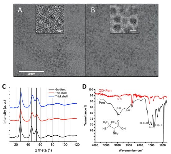 The QDs were synthesized, then transferred to the aqueous phase using ligand exchange with D-penicillamine, as previously described []. For this purpose, a solution of 0.2 M D-penicillamine was prepared in MilliQ water and degassed for 15 min with Ar. We then added 200 µL of Tris (2-carboxyethyl) phosphine hydrochloride (TCEP) to the reaction to avoid disulfide bond formation, and adjusted the pH to 9 with a 25 wt% solution of tetramethylammonium hydroxide (TMAOH) prepared in methanol. The solution was degassed for 15 min with Ar. Then, 0.5 mL of this D-penicillamine solution was added to 1 mL of QD suspension at 3–5 µM, also previously degassed. This mixture was biphasic. It was stirred for 45 min at room temperature, then centrifuged to separate the two phases. The upper phase, which contained the QDs, was sampled and purified using a NAP10 size exclusion column (Sephadex G-25 DNA grade, GFischer Scientific, Illkirch, France). This removed excess ligands and remaining traces of chemical products from the synthesis. The columns were calibrated either with phosphate-buffered saline (1X PBS) buffer or with deionized water; the same were used as eluent and storage mediums for the QDs. They were kept at 4 °C in the dark and under an argon atmosphere, in order to reduce as much exposure as possible to oxygen from the air and to UV light. In these conditions, they remained stable for 1 year when transferred in PBS and for more than 3 years when transferred in ultrapure water, without any change in their optical properties or any sign of precipitation. Their physico-chemical characteristics (primary size, composition, size distribution, nr. of shells, zeta potential, photophysical properties) are summarized in Table S1 and cryo-transmission electron microscopy (cryo-TEM) images, X-ray diffraction patterns and FT-IR analyses are shown in Figure 2. As expected, thick shell QDs are larger than gradient shell QDs (Figure 2A,B), and the diffraction peaks shift to larger angles with increasing ZnS shell thickness (Figure 2C) due to the higher compressive strain, leading to a lower lattice parameter of the heterostructure. Moreover, the FTIR spectrum shows that, in comparison with free penicillamine (Pen, black), the sulfhydryl signal at around 2550 cm−1 is absent after coordination to the QD surface (Figure 2D). The COO− asymmetric stretching band remains predominant at 1600 cm−1, while the NH+ bending signal at 1500 cm−1 becomes much lower in bound pen. The COO− symmetric stretch exhibits a slight shift from 1400 to 1410 cm−1. (N.B.: The bands at around 2350 cm−1 correspond to CO2 from the working atmosphere.)