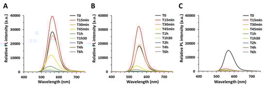 Artificial weathering in environmental conditions caused progressive loss of the PL emission (Figure 3) and of the characteristic excitonic peak at 512 or 518 nm (Figure S2), which proves QD degradation. For both the thin shell and thick shell QDs (Figure 3A and Figure 3B, respectively), the PL first increased after 15 min of weathering, which corresponds to the elimination/photo-curing of surface defects []. Then the PL of both types of QDs decreased progressively with weathering duration, finally reaching <10% of the initial PL after 1 h and 1 h 30 of weathering of the thin shell and thick shell QD, respectively (Figure 3A,B).