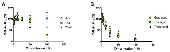 We previously reported that all three aged QDs drastically reduced cell viability while only the gradient shell pristine QD altered it, via measurement of cell metabolic activity using WST-1 assay []. In the present study, this was confirmed via measuring the impact of pristine and aged QDs on cell membrane integrity, using the LDH assay. For this experiment, QDs were weathered for 24 h in order to reach total degradation of the three compositions. Among pristine QDs, we confirmed that only gradient shell QDs reduced cell viability, and only at the highest tested concentration, which was 100 nM (Figure 4A). Conversely, the three aged QDs were cytotoxic to human primary keratinocytes, with a significant reduction of cell viability from 12.5 nM (Figure 4B). No significant difference of toxicity was observed between the three aged QDs, except at 25 nM where aged thick shell QDs were more cytotoxic than gradient shell and thin shell QDs. Analysis of these cytotoxicity curves permitted the determination of the lethal concentration 50 (LC50), i.e., the concentration leading to 50% of cell death. It was 77 nM for pristine gradient shell QD, 22 nM for aged gradient shell QD, 23 nM for aged thin shell QD, and 16 nM for aged thick shell QD.