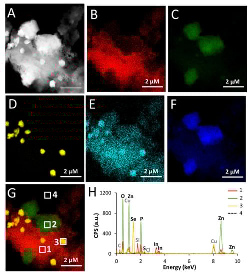 Characterization of aged thick shell QDs by STEM-EDX. (A) STEM (HAADF) imaging of aged thick shell QD, (B–F) elemental distributions of In (B), Zn (C), Se (D), S (E), and P (F). (G) merge of (B,C,D), showing four regions from which EDX spectra were extracted (regions indicated as 1, 2, 3, 4 in G); these DX spectra are reported in (H).