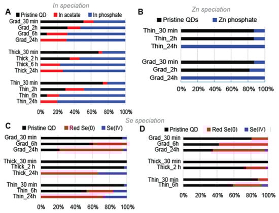Proportion of In, Zn, and Se species forming upon QD irradiation. These proportions are derived from linear combination fit of EXAFS spectra at the In K-edge (A), at the Zn K-edge (B), and from XANES and EXAFS spectra at the Se K-edge ((C,D), respectively).