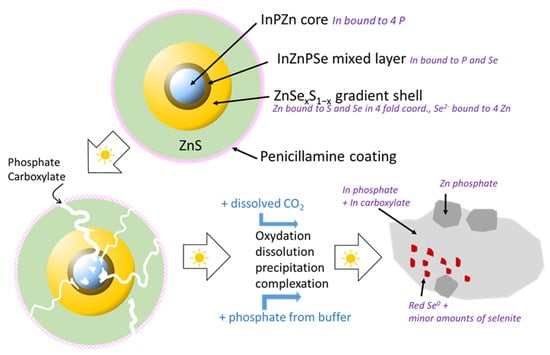 Scheme of the proposed processes taking place during aging of the QDs under simulated sunlight exposure. Photodegradation leads in a first stage to the loss of penicillamine surface ligands inducing the precipitation of the QDs. Partial degradation of the ZnS outer and Zn(Se,S) intermediate shells gives access for complexing agents, such as phosphate, to the InZnP, leaching In3+ in form of In-phosphate and -carboxylate. Finally, the core and the shell undergo complete dissolution, leading to oxidation products such as red Se(0), SeO32−, SeO42−, SO42− and PO43−. The secondary phases result from the precipitation/complexation of the released metal cations with these anions present in solution. The kinetics of the different stages of photodegradation depend on the core/shell structure: they are fastest for the gradient shell system without additional outer shell, and slowest for the core/shell/shell structure with a thick ZnS shell.
