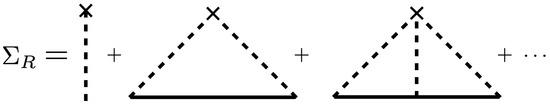 and we have a similar behavior for higher order products. Now, notice that, for , we have , and so on. We define the concentration of defects, i.e., the number of dislocations per unit of area perpendicular to the cylinder’s axis as . As discussed in standard references [28,29], for small concentrations , the scaling discussed before ensures that the total Green’s function in Equation (25) can be calculated accurately by the sequence of diagrams for the retarded self-energy in momentum space as given in Figure 4, an approach well known as the non-crossing approximation (NCA). This series of diagrams corresponds to the configurational average of the T-matrix over the random distribution of dislocations after Equation (23)