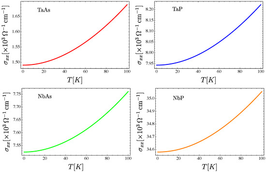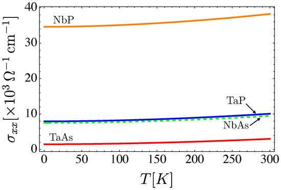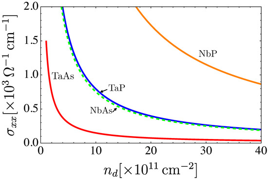 In this section, we apply the theory and analytical expressions obtained in the previous section to calculate the electrical conductivity of several materials in the family of transition metals’ monopnictides, i.e., TaAs, TaP, NbAs, and NbP. For an estimation of the concentration of defects in real crystal systems, Ref. [24] reports that the native concentration of dislocations in the lattice of the materials TiO2 and SrTiO3 varies in the range –. These concentrations can be enhanced using different treatments up to , close to the rendering amorphous limit. The microscopic/atomistic parameters involved in our theory are obtained from ab-initio studies for WSM materials, as reported in Refs. [25,26]. In particular, the later reference identifies anisotropies in the Fermi velocities and density of charge carries at different Weyl nodes and bands. Using these results for the densities of carriers, we compute the Fermi momentum at each Weyl node, i.e., , as displayed in Table 1.