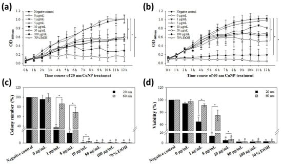 Bactericidal activities of CuNPs. E. coli were treated with different concentrations of CuNPs of 20 nm or 60 nm size. Bacteria treated with PBS or 70% alcohol were used as the negative and positive controls, respectively. (a,b) Determination of E. coli growth by optical density measurement. Cell growth curves from 0 to 12 h were analyzed with absorbance at 600 nm wavelength. Statistical calculation after treatment for 12 h was analyzed. (c) The percentage of colony formation of E. coli recovered after treatment with CuNPs for 24 h. (d) Bacterial viability analysis with PrestoBlue assay after treatment with CuNPs for 24 h. Bioactivities were determined at the emitting fluorescence of 590 nm. In both (c,d), one hundred percent value corresponds to the number in the negative control. Data are presented as mean ± SD from three independent experiments performed in triplicate for each treatment group. Statistical comparisons were performed by Student’s t-test; α and β indicate p < 0.05 for 20 and 60 nm CuNP treatments relative to the negative control, respectively, and * indicates p < 0.05 for comparisons between 20 and 60 nm of CuNPs in (c,d).