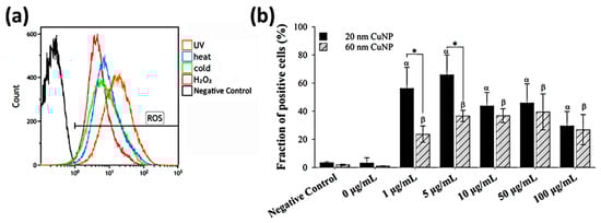 ROS generation in E. coli after CuNP treatment. (a) Flow cytometry analysis of ROS induced by various inducers in E. coli. Four groups of bacteria were subjected to the following conditions to induce ROS: 405 nm UV light for 3 h, 45 °C for 2 h, 4 °C for 2 h, and 3% H2O2 for 30 min. Bacteria cultured under normal conditions (37 °C, LB medium) and then washed with PBS served as the negative control. H2DCFDA was applied to bacteria to detect ROS. (b) Fractions of fluorescent positive cells in different CuNP treatments. Bacteria were treated with two sizes of CuNPs in different concentrations for 24 h and then stained with H2DCFDA. Fluorescence was detected by flow cytometry. These data are presented as mean ± SD from five independent experiments performed in triplicate for each treatment group. Statistical comparisons were performed by Student’s t-test; α and β indicate p < 0.05 for 20 and 60 nm CuNP treatments relative to the negative control, respectively, and * indicates p < 0.05 for the comparisons between 20 and 60 nm of CuNPs.