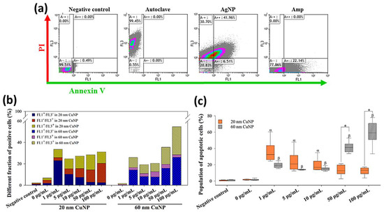 Adopting the patterns as described in [31], that annexin V-positive/PI-negative (FL1+/FL3−) and annexin V-positive/PI-positive (FL1+/FL3+) cells are apoptotic bacteria in early and late stages, respectively, then annexin V-negative/PI-positive (FL1-/FL3+) cells represent dead bacteria in the non-apoptotic phase. In the results shown in Figure 6a, about 99.45% of E. coli were dead cells with non-apoptotic features (FL1−/FL3+) in autoclaving treatments, while high fractions of cells were detected as apoptotic cells (FL1+) in AgNP or Amp treatments (48.47% and 22.14%, respectively) (Figure 6a). In the groups treated with 20 nm CuNPs, a high fraction of apoptosis (FL1+; Figure 6c), more specifically, early apoptosis (FL1+/FL3−), was seen at low concentrations (Figure 6b). The population of apoptotic cells in the 1 μg/mL-treated E. coli reached about 30% (Figure 6c), higher than the level seen in Amp-treated cells (22.14% in Figure 6a). As the concentration of 20 nm CuNPs increased, cell fractions shifted from the early apoptotic (FL1+/FL3−) to the non-apoptotic (FL1−/FL3+) phase (Figure 6b). In comparison, in the groups treated with 60 nm CuNPs, the fractions of apoptotic cells (FL1+; Figure 6c) at 1, 5 and 10 μg/mL were about 20%, and surged to high levels at 50 and 100 μg/mL treatments (41.3% and 59.1%, in 50 and 100 μg/mL, respectively; Figure 6b).