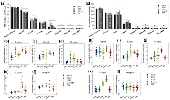 The decreases in cell viability were concentration-dependent in both sizes of nanoparticles in the absence or presence of the modulators (Figure 7a,g). Statistics suggested that E. coli cells exposed to 1 and 5 μg/mL of 20 nm CuNPs were rescued using Z-VAD (Figure 7b,c). For the 60 nm CuNP treatment groups, Z-VAD was able to rescue E. coli at all concentrations except for 100 μg/mL (Figure 7h–l). Using NSA, increased cell viability was observed in the 10, 50, and 100 μg/mL 20 nm CuNP treatment groups (Figure 7d–f). Significant improvement of cell viability by NSA was detected in the cells treated in 5, 10, and 50 μg/mL of 60 nm CuNPs (Figure 7i–k). SBI rescued the cells treated with 1, 5, and 50 μg/mL of 20 nm CuNPs (Figure 7e,f). SBI-dependent cell rescue only existed in the 5 μg/mL 60 nm CuNP group (Figure 7i). Wort was only able to increase cell viability in the 100 μg/mL 20 nm CuNP group.