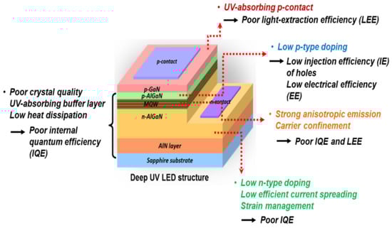 The different performance factors caused by the different layers involved in the fabrication of UV-LEDs are also highlighted in Figure 3. The main parameters that ensure the better performance of UV-LEDs are the external quantum efficiency, the wall-plug efficiency (WPE) and the optical output power Pout. The values of these parameters for near UV-LEDs are considerably less competent than visible LEDs. The reasons for the low efficiency come from low conductivity of semiconductor heterostructure interfaces, poor ultraviolet light reflectivity of n- and p-contacts and poor transparency of semiconductor layers to UV light [14], So UV-LEDs still offer a wide space for improvement and very elementary and necessary development consists of aggregate light extraction efficiency (LEE) of near UV-LEDs. Most of the UV-LEDs heterostructures are grown on sapphire substrates that provide a low-cost template for ultraviolet emitters, but with a larger lattice mismatch of about 14% between sapphire and aluminum nitride surface, resulting in the creation of several dislocations at the sapphire–AlN interface. One of the major challenges is the comparatively high operating voltages of gallium nitride based UV-LEDs, which causes the poor electrical conductivities of Si- and Mg-doped AlGaN layers [9].