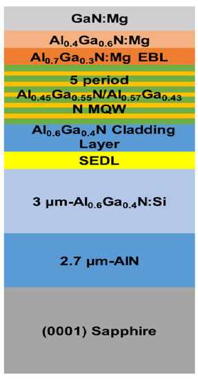 Z. H. Zhang et al. specifically designed DUV-LED with a superlattice p-type electron blocking layer (p-EBL). This superlattice p-EBL enabled a high hole concentration, which in turn increased the hole injection efficiency into the MQWs [21]. K. Nagamatsu et al. investigated the emission intensity of AlGaN-based deep-UV-LEDs under the effect of a highly Mg-doped strain relaxation layer [22]. They concluded that due to excessive Mg doping, the self-formed voids are formed which were very influential in increasing strain relaxation and resulted in improved output efficiency. Furthermore, they found that with a strain relaxation layer on sputter-annealed AlN, the emission intensity of LEDs increased 11-fold compared to the absence of strain relaxation layer. Jiahui Hu proposed a superlattice electron deceleration layer (SEDL) to slow down the electrons injected to the active region, thereby improving the radiative recombination, as shown in Figure 6. External quantum efficiency of 3.43% was calculated at 40 mA, indicating that the WPE is 2.41% with Al-content chirped SEDL [23].
