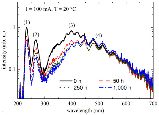 N. Trivellin et al. reported on the spectral characterization with temperature variations and studied the reliability of DUV-LEDs. For both stress currents of 350 mA and 500 mA, continuous current reliability testing was carried out. The results indicated a subsequent degradation of the 280 and 354 nm emission peaks (Figure 10). Corresponding to the stress applied, a novel emission peak emerged: a relatively wide peak with its maxima located at 540 nm approximately [48].