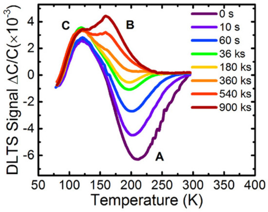 DLTS spectra of UV-C LED measured under a reverse bias of −6 V. Reproduced with permission. [64] Copyright 20120, AIP.
