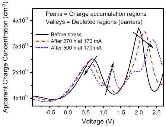 M. Meneghini et al. used capacitance–voltage (C-V) characterization to investigate the workable modification in the charge distribution and dopants within the active layer generated by the stress treatment [54]. In Figure 16 they illustrated the apparent charge distribution (ACD) profiles brought about one of the tested specimens throughout the stress analysis. Their outcome corresponded to the generation as well as the dispersion of charged centers within the QW region. It also brings forth information on the positioning of the semiconductor region modified by the demeaning procedure [42].