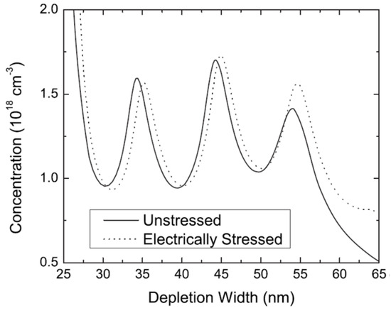 ACD profile of an unstressed and electrically stressed device as a function of depletion width. Reproduced with permission. [62] Copyright 2010, AIP.