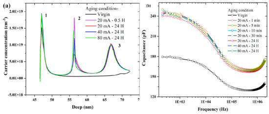 Our group figured out the CV measurements in a frequency range of 200 Hz–2 MHz to verify the subordination of the capacitance characteristics [73]. The capacitance–frequency is illustrated in Figure 18. It is clear that the application of the current in the first minute accumulated a large increment in the capacitance. Later on, the capacitance was stabilized with minute variations even when the device was stressed consistently. In the first 0.5 h of degradation, we noticed the carrier variations within the range of 200 Hz-2 MHz for a minute’s stress. Hence, we concluded that the consistent longer reduction of optical power (OP) is not probable to be activated by the rise in the traps [74].