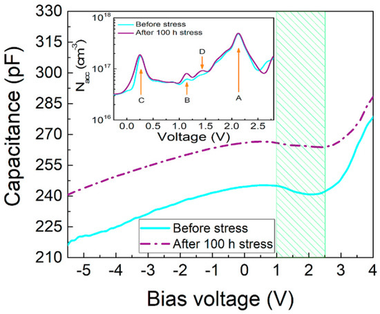 Matteo Meneghini et al. in another study obtained the positioning of the degraded area using capacitance–voltage (C-V) measurement. They found that the stress caused the free carrier density to reduce in the active region and modified the distribution of free charge close to the QW. Hence, as a result of stress, the active region charge could be reimbursed to a certain extent [62]. Craig G. Moe et al. performed capacitance–voltage (C-V) measurements not only on the unstressed devices but also on the electrically stressed devices at 20 mA. The electrically stressed QWs were positioned at a larger obvious depletion width as compared to the unstressed device [46]. When the p-side to the biased QW was observed, a broader depletion width was noticed. This conclusion indicated that the depletion region expanded into the p-layer right after the electrical degradation took place. The possible reason is that near the heterojunction, the p-type carriers in the barrier region got reimbursed (Figure 17).