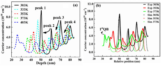 Our group also performed CV measurements on 255 nm UV-LEDs and the obtained ACD function is shown in Figure 21a [56]. It can be seen that the increase in temperature caused a decrease in carrier peak of the first quantum well rapidly, so we concluded that at elevated temperatures, the concentration of carriers in the well decrease rapidly and these carriers also diffuse to the p-side EBL at 373 K. For support of our findings, we also used Silense 1D simulator to observe the carrier distribution during thermal changes as shown in Figure 21b. Finally, we have summarized the operating conditions and corresponding capacitance response in Table 3.