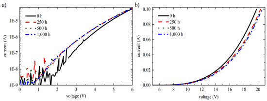 Figure 22a,b illustrates the forward-bias I-V characteristic curve of one LED carried out after a distinct procedure interval by Johannes Glaab et al. The current for a corresponding voltage lower than the start-up voltage (Vturn-on = 5.3 V) raised minutely in the interval of initial 250 h of the procedure (see Figure 22a) [36]. For operation times greater than 250 h, the current for this relevant voltage holds out consistently. In contrast to that, the current at a rooted voltage greater than the start-up voltage lowered consistently (Figure 22b).