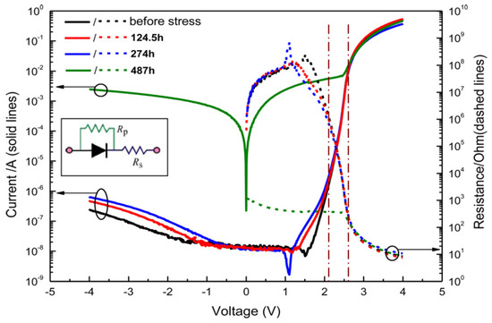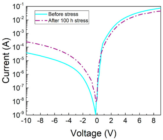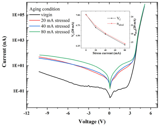 For the degradation analysis using I-V curves, three main regions have been discussed mostly in the literature: (1) the reverse bias region; (2) the low forward-bias region; and (3) the above turn-on voltage bias region. These regions behaved differently when the degradation goes on, as discussed in the following section.