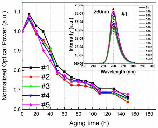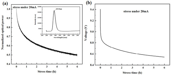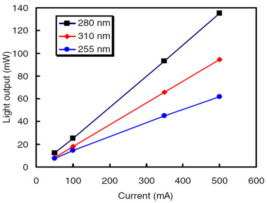 Johannes Glaab et al. employed multiple-quantum-well (MQW) DUV-LEDs pouring out 233 nm wavelengths stressed at a persistent current of 100 mA for 1000 h of processing, as indicated by Figure 8 [36]. In the first 250 h, the MQW luminescence was lowered, while for the rest of the processing time, the emission power of MQW was observed to be stable. In comparison to high-current regimes, the lower ones indicated the rigorous change in the emission power when observed with changing drive current. As the formerly mentioned trend, all these effects were remarkable for the first 250 h.