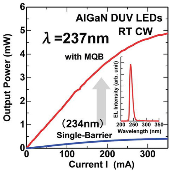 - Khan, M.A.; Maeda, N.; Jo, M.; Akamatsu, Y.; Tanabe, R.; Yamada, Y.; Hirayama, H. 13 mW operation of a 295–310 nm AlGaN UV-B LED with a p-AlGaN transparent contact layer for real world applications. J. Mater. Chem. C 2019, 7, 143–152. [Google Scholar] [CrossRef]