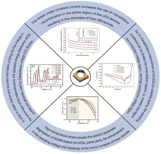 Pinos et al. studied the emission spectrum from a 285 nm AlGaN quantum well light-emitting diode (QW-LED). The results indicated that certain regions (which are micrometer-sized, domain-like areas) having lower AlN molar fractions pour out light with higher intensity. Furthermore, the various experiments performed revealed that intensity from these regions raised with time and a redshift in wavelength is observed [49]. In another study, Pinos et al. described the degradation under the influence of elevated current stress of AlGaN quantum well-based LEDs pouring out light of 285 and 310 nm wavelength. The results revealed that elevated concentration of nitrogen-vacancy and tunneling current as well as partial reimbursement of the p-doping caused to decrease in the emission intensity during the aging process [50]. Jan Ruschel et al. investigated the degradation in UV-LEDs for 1000 h of stress [51]. The influence of operation current within the range 50–300 mA was also studied in comparison to current densities in the particular range from 34 A/cm2 to 201 A/cm2. In aging operations, the optical power reduction was robustly speed-up for higher current [52,53].