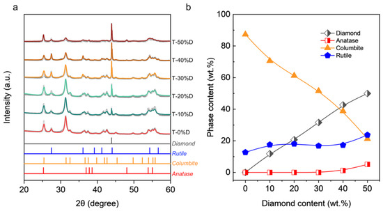 The XRD patterns of synthesized samples are given in Figure 2a. The diffraction peak corresponding to diamond can be seen in the figure, and no diffraction peaks belonging to graphite or titanium carbide were detected. These results indicate that the current synthesizing conditions avoids the graphitization of diamond, as well as the reaction between TiO2 and diamond. In addition, the diffraction peaks belonging to the rutile phase and columbite phase can also be detected, due to the phase transformation of TiO2, which is consistent with the previous research results [24]. It is worth noting that there are slight differences in the phase composition of TiO2 of the samples for different diamond additions. With the increase in diamond additions, the intensity of the diffraction peaks of the columbite phase gradually decreases, and the intensity of diffraction peaks corresponding to the rutile phase gradually increases. An incompletely transformed anatase phase was observed for the composite containing 50 wt.% diamond. Furthermore, the quantitative results of phase composition obtained by Rietveld refinement are shown in Figure 2b. With the increase in diamond additions, the content of the columbite phase rapidly decreases from nearly 87.3 wt.% in the T-0%D sample to 21.3 wt.% in the T-50%D sample. The content of the rutile phase in the composites increases with diamond content and reaches 23.7 wt.% when the diamond content is 50 wt.%. These results indicate, on the one hand, diamond hinders the phase transformation from anatase to columbite, and on the other hand, promotes the phase transformation from anatase to rutile. As the diamond content increases, the effect of hindering phase transformation becomes more pronounced; thus, when the content of diamond in the composite is 50 wt.%, the remaining anatase phase reaches 5.1 wt.%.