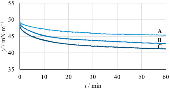 Furthermore, we investigated the influence of the Janus lobe ratio on the interfacial activity of the JNP-bPEI. The influence of the lobe size ratio on the interfacial activity of the particles is demonstrated in Figure 1. The IFT of all suspensions starts out ±1 mN·m−1 of the pristine heptane/water IFT value and then slowly declines as the particles reach the interface. This also indicates the absence of fast-acting molecular surfactants. It is apparent that increasing the size of the hydrophilic bPEI-modified P(3-TSPM) lobe increases the interfacial activity of the particles (compare curves A, B and C in Figure 1). A similar observation has been reported for similar JNPs by Wu et al. [10,18] and was attributed to the hydrophilic-lyophilic balance of the JNPs, which is also called the Janus balance [19].