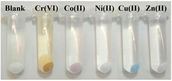 JNP-bPEI 2 mL was employed in the extraction of metal ions: Cr (VI), Co(II), Ni(II), Cu(II) and Zn(II). The procedure consisted of adding 10 mg/mL JNP-bPEI to a metal ion solution with a concentration of 10 μmol/mL, the conditions were kept constant throughout all ion extractions as described in the experimental section. The photograph in Figure 3 shows the color of JNP-bPEI 2 mL, after extraction/absorption of Cr (VI), Co(II), Ni(II), Cu(II) and Zn(II). Furthermore, to quantitatively determine the absorption capacity for each metal ion, i.e., metal ion load, the concentrations of metal ions in the supernatant were analyzed using Inductively Coupled Plasma-Optical Emission Spectrometry (ICP-OES) and compared to the initial concentration. The metal ion extraction capacity qe (mg/g) was calculated with the formula given by the Equation (1) [20].