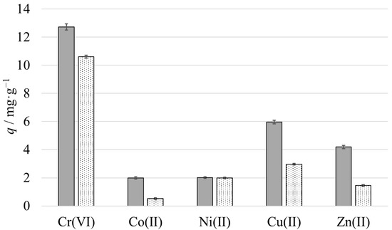 Graph showing the metal ion extraction capacity qe (solid bars) and the metal ion recovery capacity qr (dotted bars). Error bars represent ± 1 σ.