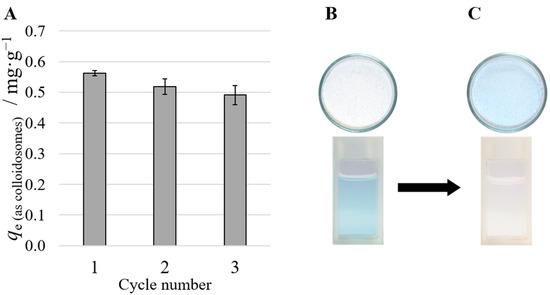 As already mentioned, the great advantage of these materials, JNPs and JNP decorated colloidosomes, is the ability to employ them in interfacial extraction technologies, with the main benefit of ease of deployment, collection and recovery from the water’s surface and re-deployment on the surface of the water for the subsequent metal ion extraction/recovery cycles. To test the versatility of these JNPs-decorated wax colloidosomes in such technologies, we have deployed them for Cu(II) extraction. The graph in Figure 6A shows the extraction efficiencies qe for three consecutive cycles from fresh 10 mM Cu(II) solutions, as described in the experimental section. In a different experiment, two portions of 6 g of colloidosomes were used to extract Cu(II) from the same 10 mL solution with an initial concentration of 10 mM. After the first extraction cycle, the concentration of copper in the solution was reduced to 4 mM and after the second extraction cycle, the concentration of Cu(II) decreased further to 0.3 mM, see Figure 6B,C. The numbers are in good agreement with the extraction capacities qe calculated by the “differential concentration” method: (qe ≈ 0.55 mg/g Colloidosome ≈ 8.7 µmol/g ≈ 52 µmol Cu(II)/6 g Colloidosome; 10 mL soln. with c = 10 mM → 100 µmol Cu(II)). The photographs in Figure 6B,C clearly demonstrate that a floating layer of 6 g of wax colloidosomes decorated with JNP-bPEI 3 mL, placed above a water solution of Cu(II) ions, and after brief shaking to ensure the wetting of the nanoparticles, is capable of almost complete interfacial extraction of the ions overnight. Next, the metal-loaded colloidosomes can be easily collected from the water’s surface and dried; see the color change from white to blue of colloidosomes, before and after the Cu(II) metal ion extraction in the photographs of Figure 6B,C. The experiments were limited only to extraction, to demonstrate the working principle and versatility of wax colloidosomes and a recovery cycle for Cu(II) was not made.