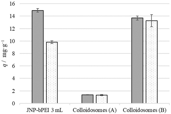 Comparison of qe (filled bars) and qr (dotted bars) between JNP-bPEI 3 mL and the colloidosomes that were prepared with it. q of Colloidosomes (A) was calculated using the total mass of the colloidosomes. q of Colloidosomes (B) was calculated using the approx. mass of JNP-bPEI in the colloidosomes.
