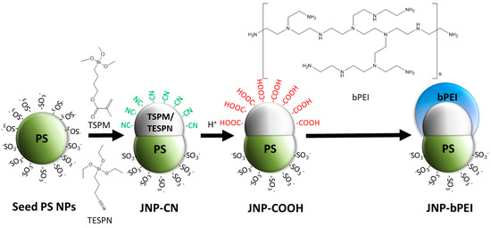 Reaction scheme depicting the synthesis of seed PS JNPs, synthesis of JNP-CN and their conversion into JNP-COOH and JNP-bPEI.