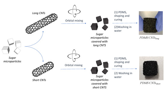 Therefore, to produce spongeous piezoresistive sensors, we used a successful procedure based on a solvent-free mechanochemistry approach [20,26,27,28,29]. This allowed us to avoid the functionalization of the nanomaterials, thus preserving their morphological and electrical properties (Figure 2). In brief, the MWCNTs were mixed overnight in an opportune ratio with the sugar microparticles using a rotatory shaker. During this step, the tangled carbon nanotubes were able to impact with the sugar microparticles, thus addressing the disruption of the MWCNTs bundles, due to the mechanical breaking of π-π interactions. At the same time, the nanomaterial could be homogenously adsorbed onto the glucose crystals surface. After that, the mixtures with the two different MWCNTs were mixed with the same amount of PDMS prepolymer diluted with hexane in the ratio 2:3 w/w. The as-obtained mixtures were then sieved to remove the polymer in excess, and cured in a closed stamp under constant pressure. Finally, the sugar crystals were dissolved by simply washing the composite in hot water, thus obtaining two sponges with pores of dimensions comparable with the sugar crystals. The two nanocomposites were nominated PDMS/CNTsshort and PDMS/CNTslong, depending on the type of MWCNTs used.