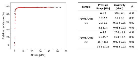 Although GF can give an idea of piezoresistive sponge performances and behavior, pressure sensitivity should also be evaluated in order to understand the effective capacity of piezoresistive materials to monitor low displacement under minimum forces. The pressure sensitivity (S) can be calculated as S = dΔR/R0/dP, in which P is the applied pressure value in pascals. From Figure 6, it is evident that the use of MWCNTS with different lengths allows the production of materials with different measurable pressure ranges. At the same time, an increment in low-pressure sensitivity is observed for the nanocomposites produced with longer MWCNTs, while these differences disappear at higher pressure. Further details shows that the experimentally recorded curves can be approximated with four linear fit (R2 > 0.9), as reported in the table embedded in Figure 6. The larger differences in sensitivities can be observed at lower pressure, since the current variations are dominated by the formation of new contact points between carbon nanotubes, analogously to what was observed in the evaluation of the GF. For pressures higher than 35 kPa, sensitivity did not vary between the two nanocomposites, because the current variation is dominated by the change of pore dimension. The only difference at higher pressure is represented by the increase in the pressure that can be sensed. In particular, longer carbon nanotubes allow the monitoring of higher pressures, due to the increase in mechanical stability of the nanocomposite. Interestingly, the values relative to pressure sensitivities recorded in all the materials prepared here are incredibly low with respect to other most-performing systems reported in the literature [33,36,40,42,43]. In particular, the PDMS/CNTslong sponge showed an outstanding value of 330 kPa−1 for pressures lower than 1 kPa.