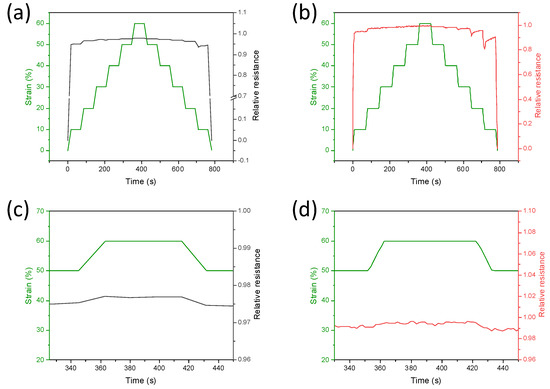 Time-resolved current variation at different strains measured on PDMS/CNTslong (gray curve), (a) and PDMS/CNTsshort (red curve). (b) Sponges subjected to loading/unloading steps from 0 to 60%. In (c,d), the enlargement at 60% strain is reported.