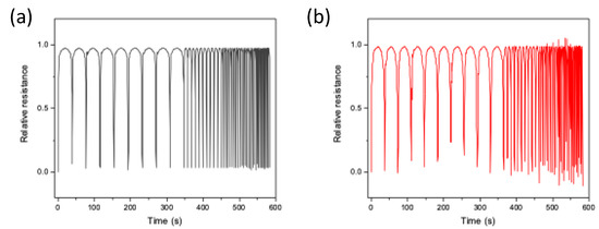 To further characterize the sponges, the stability under different cycles at 20% strain was also evaluated (Figure 8). Notably, the PDMS/CNTs sponge prepared using longer carbon nanotubes has a very good response, being able to follow all the compression and release cycle at different frequencies with good reproducibility. On the other hand, the electrical response of the PDMS/CNTsshort sponge appears more variable. This in part confirms what was already observed in Figure 7, thus suggesting that composites made of shorter carbon nanotubes need more time to recover their original state, thus causing a less reproducible response during fast compression/decompression cycles.