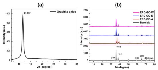 XRD pattern of (a) graphite oxide and (b) uncoated and EPD-GO-coated Mg samples.