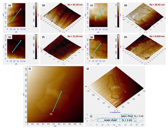 The morphology of EPD-GO-coated Mg samples and GO sheets was scanned by semicontact AFM mode. Figure 2i,j present the height profile and 3D morphology of GO sheets. GO nanosheets acquired thickness of ~1 nm and a lateral dimension of ~400 nm. Surface roughness, being a vital parameter, was evaluated to estimate coating adhesion and coverage on substrate [56,57]. Figure 2a–h show the morphology and surface roughness values of EPD-GO-coated Mg samples, as well as of the bare Mg sample. Mean roughness (Ra) of bare Mg, EPD-GO-A, EPD-GO-E, and EPD-GO-W were 34.10 nm, 26.41 nm, 11.54 nm, and 9.65 nm, respectively. Ra of EPD-GO-A sample was higher than other coated samples, as sonication of graphite oxide in acetone was not good as it was in ethanol and water. There were chunks and particles of graphite oxide remaining besides GO sheets in acetone suspension. The high Ra of EPD-GO-A coating compared to that of other EPD-GO coatings suggests that there was more unsystematic staking of GO layers accomplished during EPD process. However, EPD-GO-W coating was the best, owing to better dispersion of GO sheets in water after quick ultrasonication of graphite oxide. The smoother EPD-GO coatings suggest GO coatings were homogenous and provided the underlying Mg substrate with more coverage as a result of its high surface area [32,58].